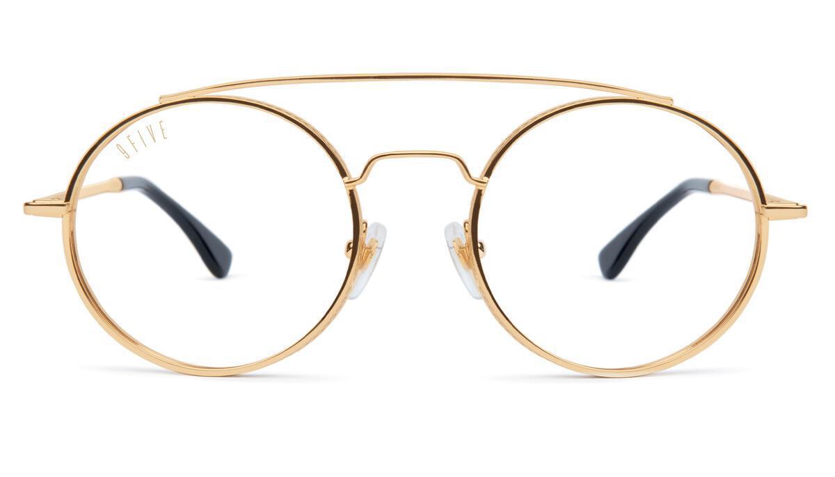 Glossy black temple tips with gold 9FIVE monogram logo embedded on each temple tip