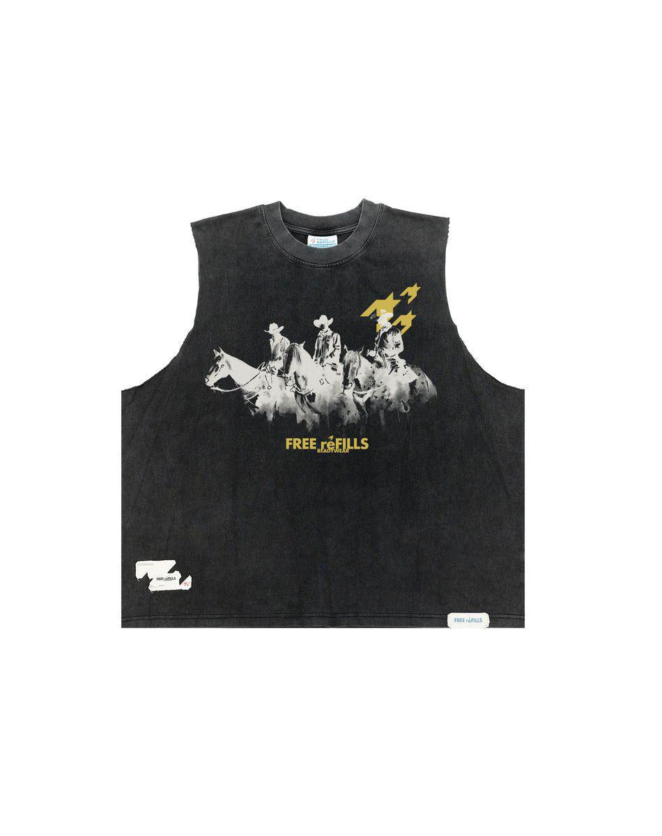 High Quality heavyweight 100% cotton cut off tank. Complete with vintage fade wash, outside logo die cut woven label and damask woven neck labels.