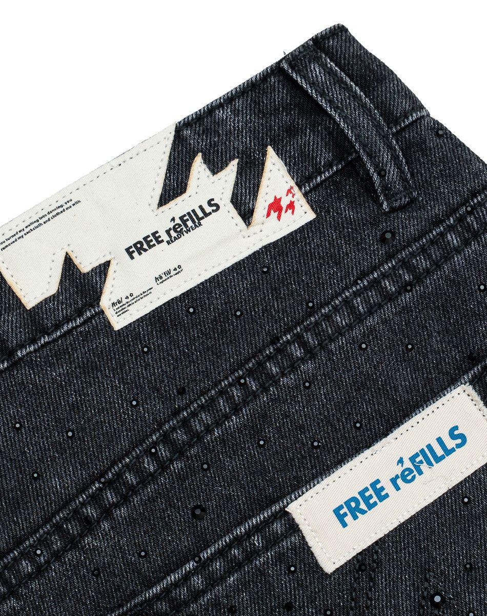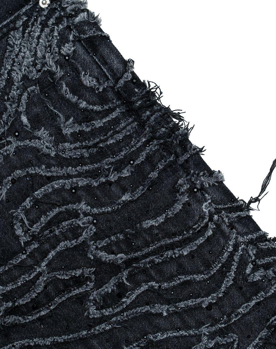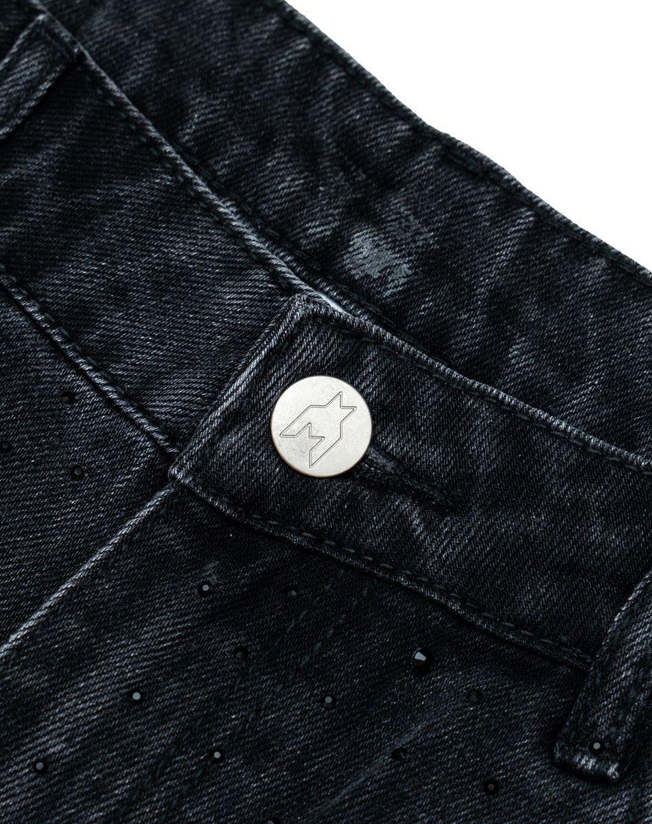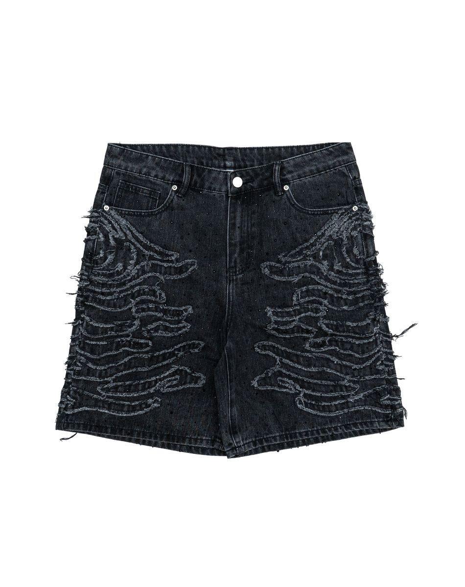 High quality heavyweight denim jorts with custom Cosmo-inspired gemstone detailing. Finished with distressed zebra-style embroidery across the front, vintage wash treatment, and hand-splattered finish. Complete with outside logo die-cut woven label and interior damask woven labels. True to size fit