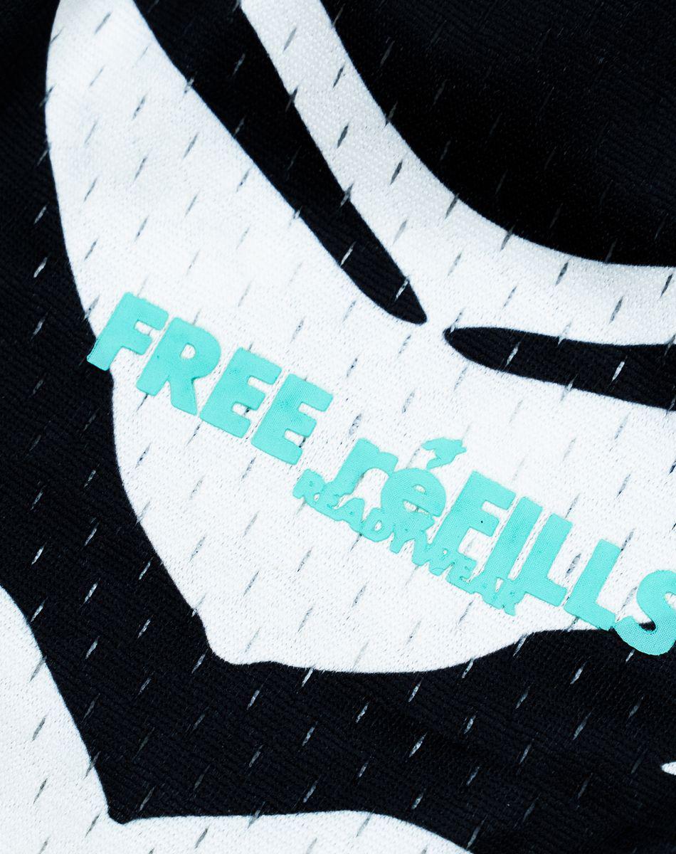 Designed as a full kit, the FRFC Zebra Jersey + Shorts set blends bold all-over zebra print with sharp teal accents. Built from breathable mesh, this uniform-inspired set brings Free Refills’ statement graphics and sport aesthetics into a standout warm-weather fit.