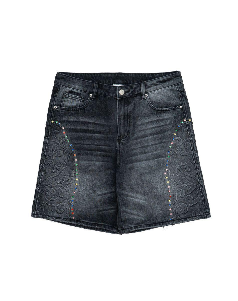 High quality heavyweight denim jorts with multicolor gemstone detailing. Finished with cathedral-inspired embossed embroidery, curved gem line accents down the front, and a vintage light black wash. Complete with outside logo die-cut woven label and interior damask woven labels. True to size fit.