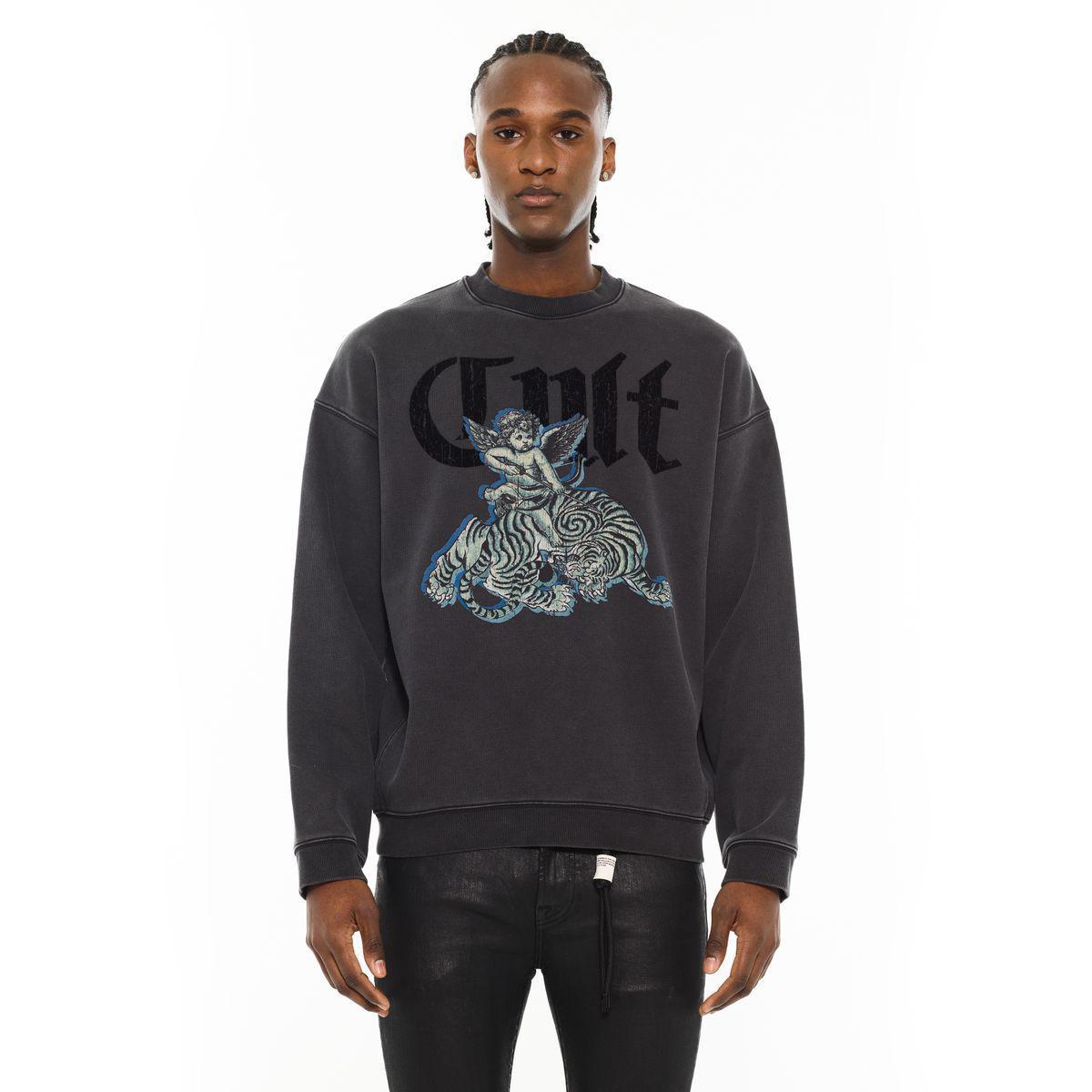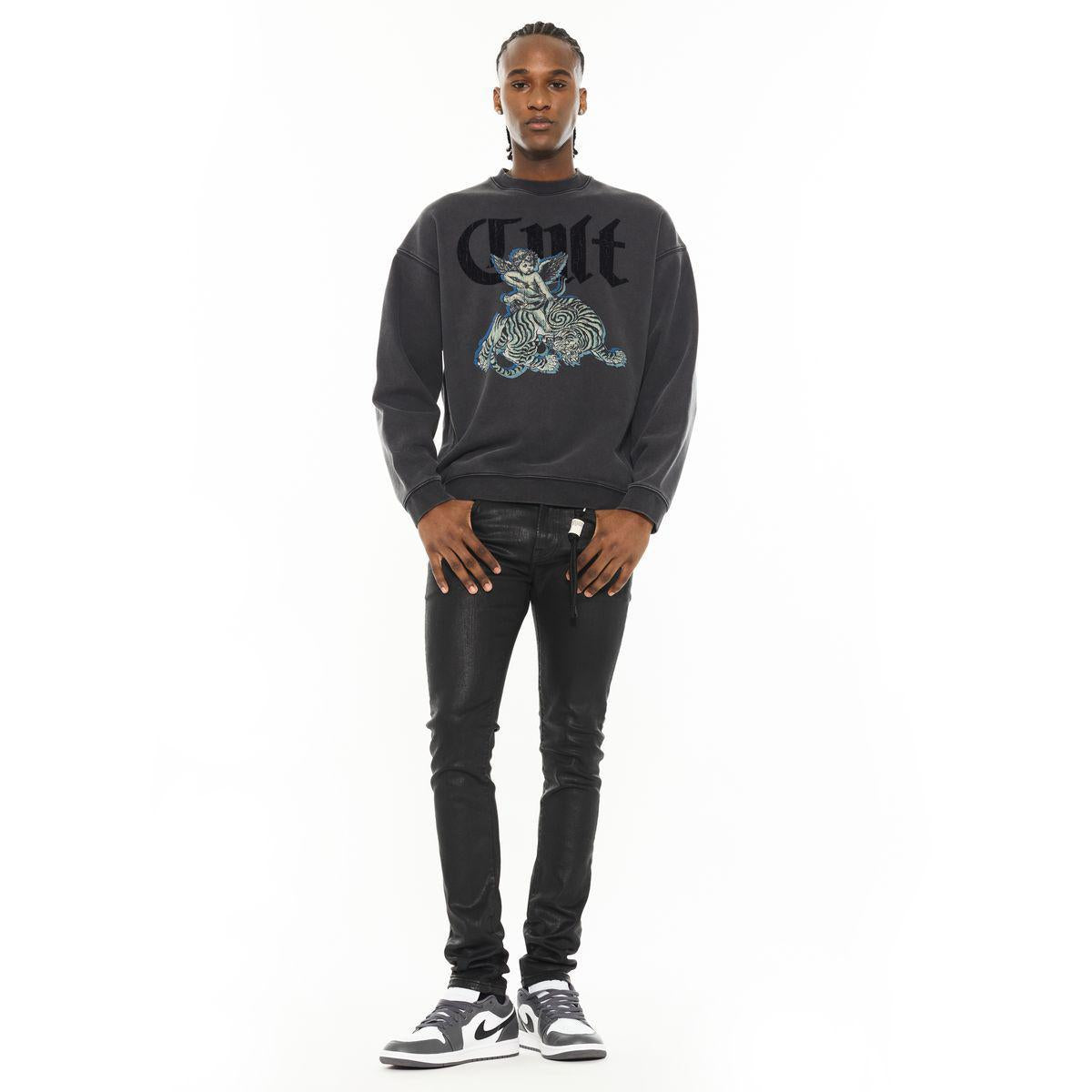 This vintage charcoal crewneck sweatshirt is crafted from high-quality French terry fabric. This piece features oversized graphics on the front and back accented with distressed felt flocking. Each detail of this sweatshirt is meticulously crafted, promising a piece that not only looks great but also feels great to wear. Whether you're hitting the streets, lounging around with friends, or making a statement at your favorite event, this sweatshirt has got you covered. -Pullover -Mid-weight French terry