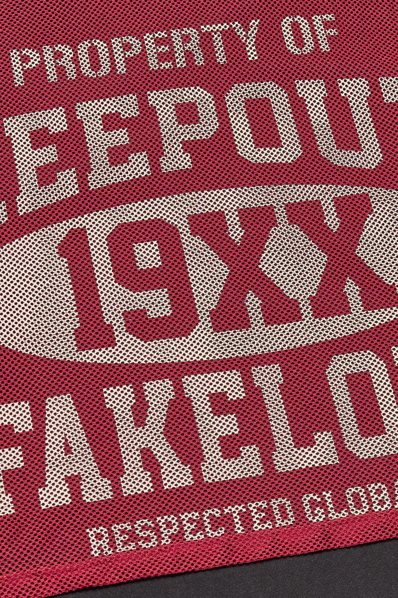 A bold, football inspired piece that fuses vintage athletic vibes with streetwear edge. Featuring a breathable maroon mesh overlay with varsity style cutouts reading "KEEP OUT FAKE LOVE 19XX" on the front and "RESPECT XX" across the back. Finished with a layered long-sleeve black underlayer and contrasting neckline for a tough, layered look built for statement wear.