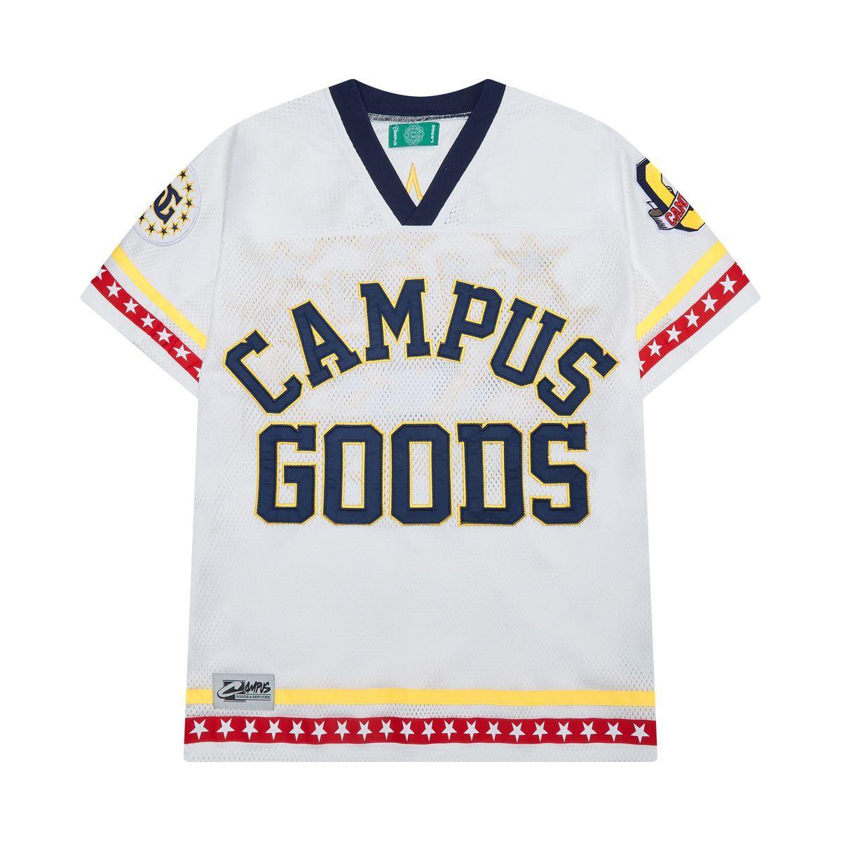 Crafted from premium breathable mesh fabric, this jersey delivers both comfort and standout style. The bold “CAMPUS GOODS” lettering on the front and oversized “98” on the back celebrate a vintage athletic aesthetic, while the red and gold star detailing across the sleeves and hem add a unique retro flair.