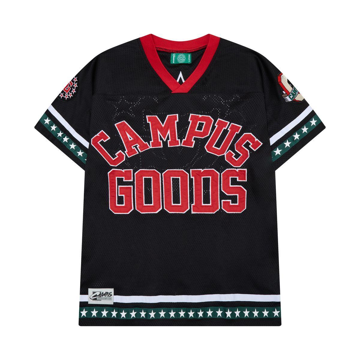 The front showcases the oversized CAMPUS GOODS logo in striking red tackle twill embroidery, balanced by varsity-inspired sleeve patches and striped hems accented with star detailing in teal and cream. The back features a large “98” tackle twill number, celebrating CAMPUS GOODS’ signature collegiate motif.
